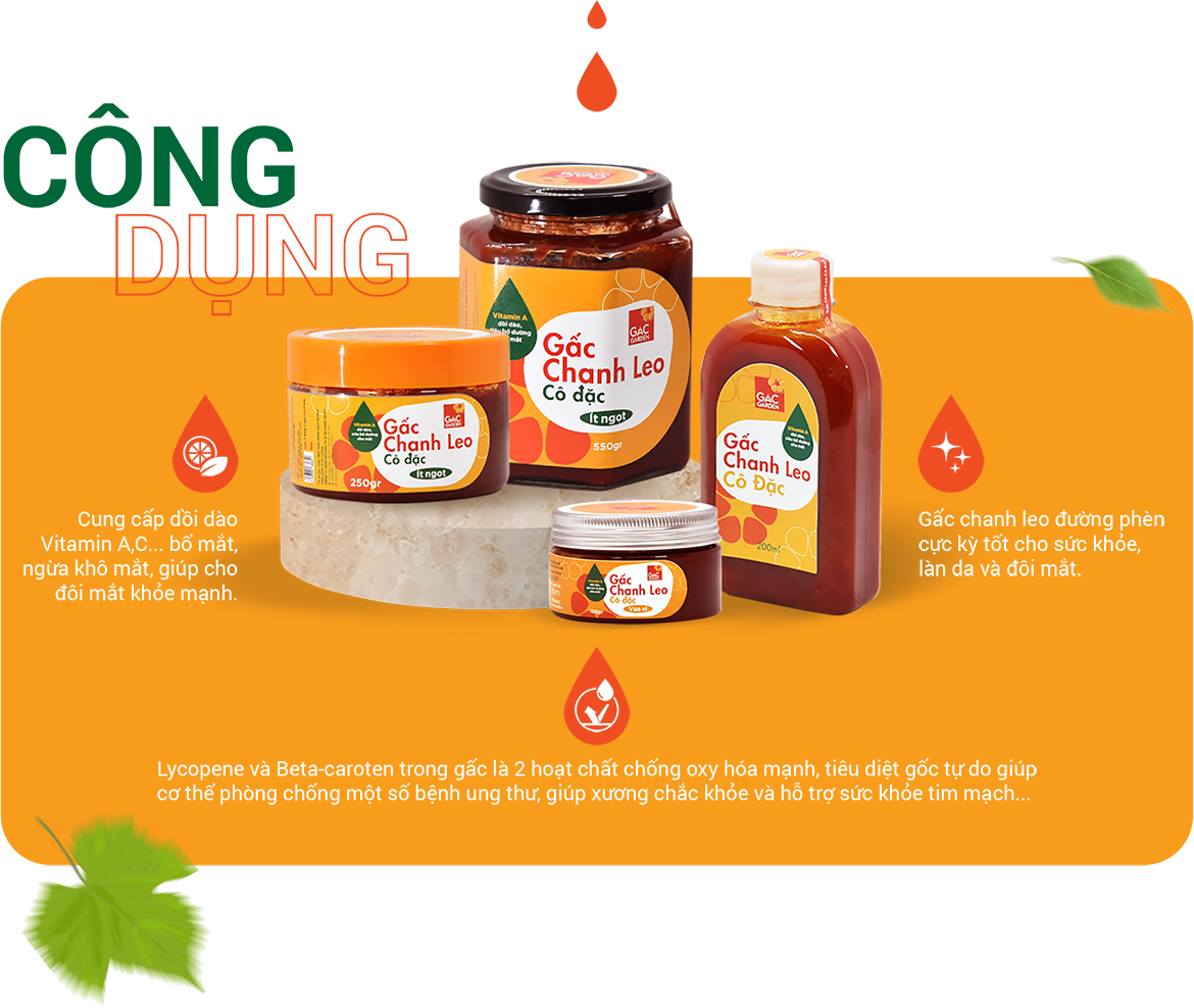 Gấc chanh leo là sản phẩm kết hợp ngọt ngào vừa vị của thịt Gấc tươi và hoa quả, đặc biệt vị chanh leo tươi thơm ngon mang đến trải nghiệm tuyệt vời cho ngày năng động. Bên cạnh bổ sung đầy đủ Vitamin A, C … thì Lycopen trong GẤC giúp tăng cường sức đề kháng cho cơ thể…